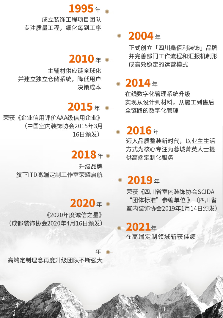 四川鑫佰利装饰有限公司,成立于2004年,初始以建筑装饰设计、施工为主体,如今,已发展成为集空间高定设计、专业墅级施工、家居软装配饰等一系列居家生活解决方案为一体的老品牌企业。从奋进中走来,四川鑫佰利装饰有限公司一次又一次地裂变、迭代、升级,只为为更多客户打造有温度、独具个性的居家空间和生活格调。