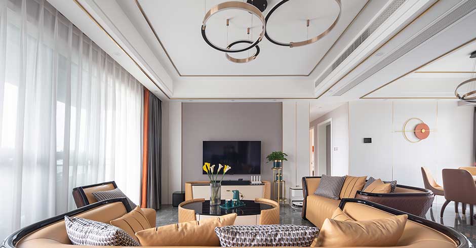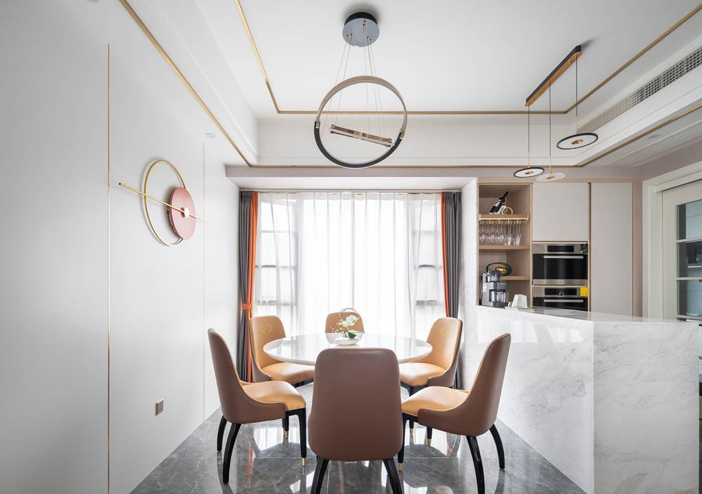 圆形金属灯具释放优雅韵味,也赋予了生活的仪式感。爱马仕橙色皮质沙发呈一定弧度落于客厅中央,将家人之间温馨聚拢,灰白抱枕进行跳色,形成丰富的视觉感官。
