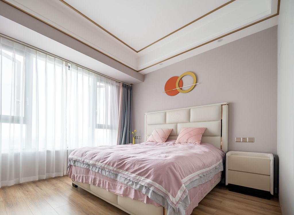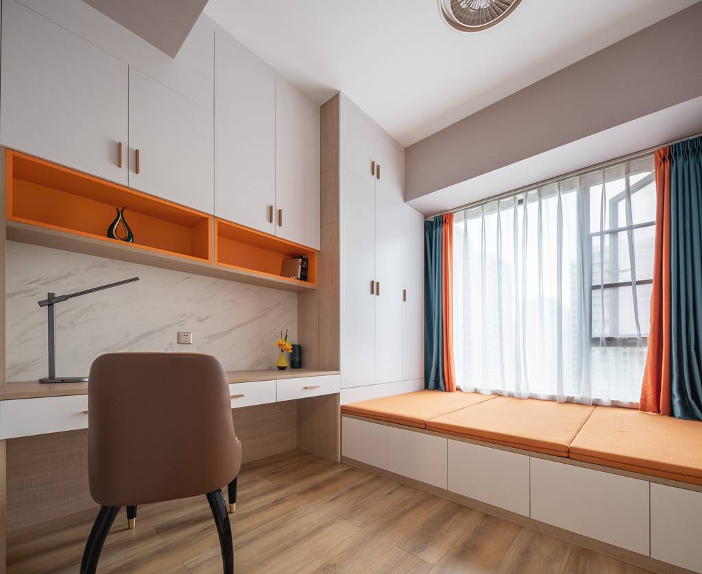 客厅空间整体以白色为主,橙色点缀其中,为空间注入活力与温度。业主喜欢轻奢质感,所以在墙面上、顶部、柜体上都有嵌入金属线条,表现出前卫的空间张力。由于原始空间沙发背后较空旷,设计师特根据业主日常喜好与后面增加休闲区,用于摆放钢琴与按摩椅,无于形中为空间带来艺术氛围。