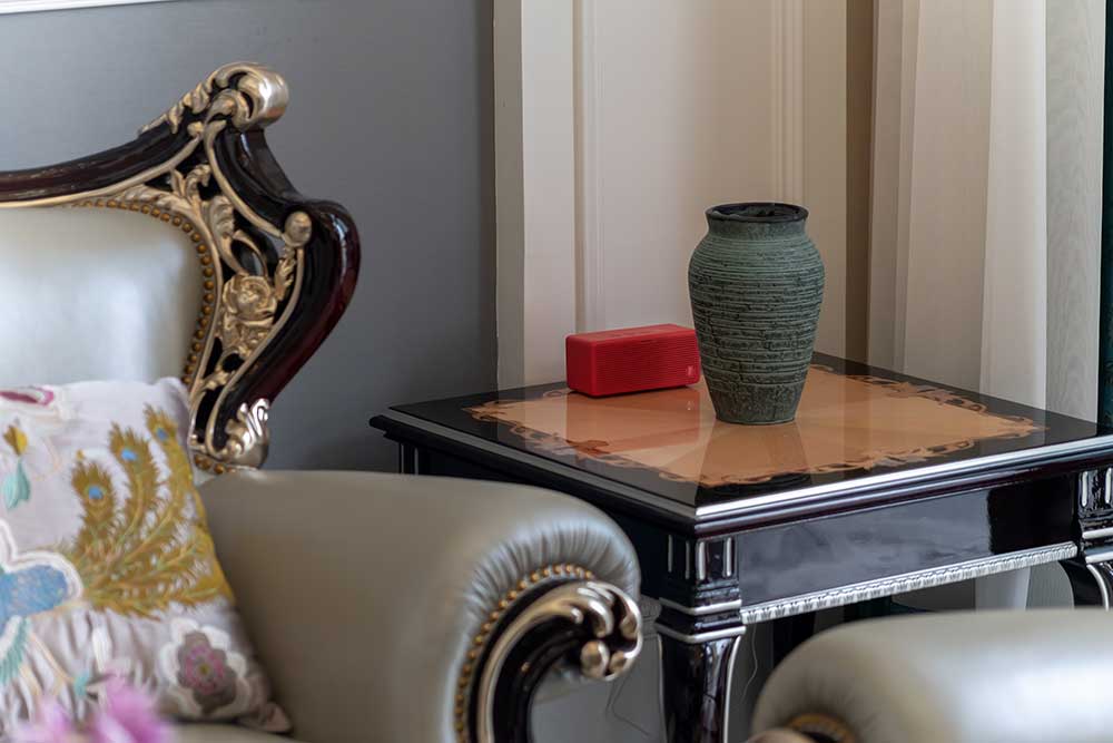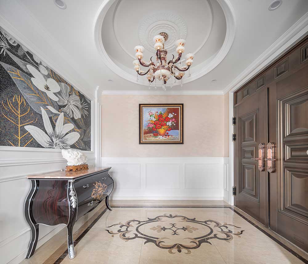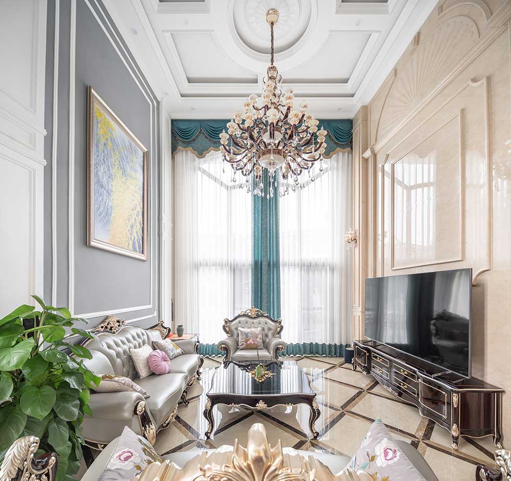 在墙面处理上,运用精心提炼过的欧式线条,材质上选用了暖色的大理石,散发着大自然的柔软、舒展的气息,营造出豪华、大气的氛围。层次分明而又精致的吊顶造型搭配气势恢宏的大型水晶吊灯,通过光线的变幻给人以高贵典雅的空间氛围。