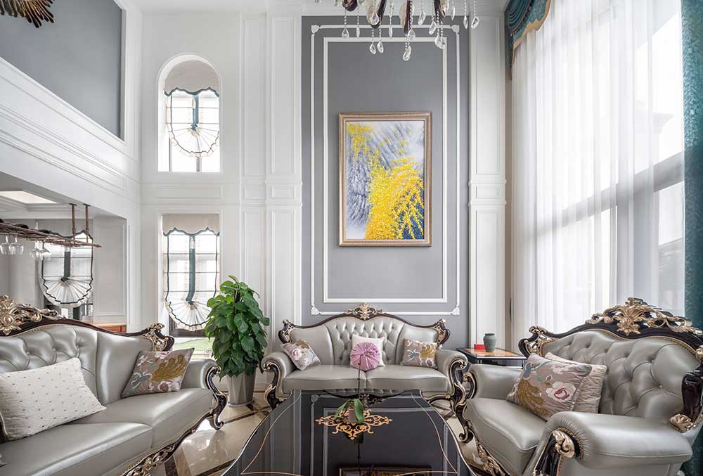 家具软装则选用灰色系、棕色及蓝色系元素,整体色彩饱和,且层次丰富。落地窗的设计给了整个空间最大的视觉发挥,给原本华贵的空间增添了一份自然气息。