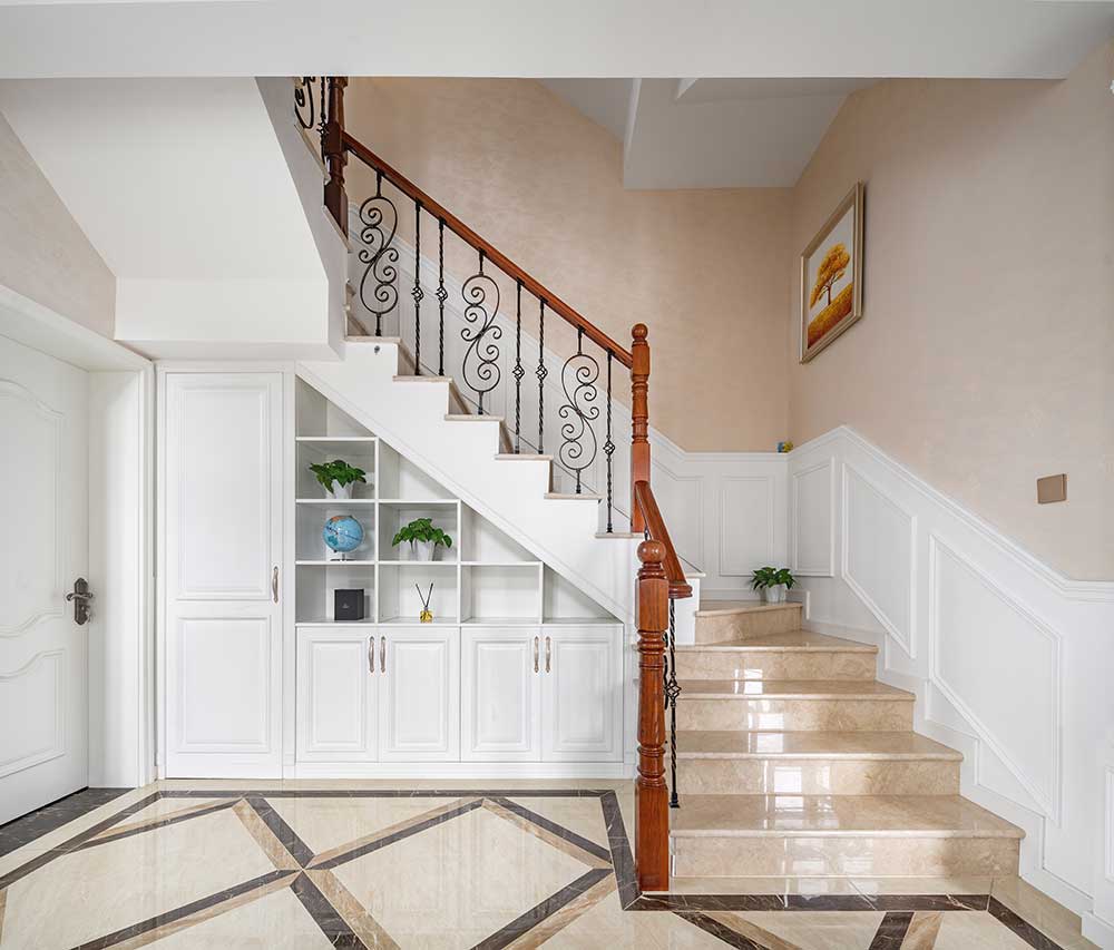深木色扶手加之金色铁艺镂空花纹,用优雅的曲线柔和了空间韵味。楼梯底部空间用来做收纳,开放式的柜子和封闭式的格子结合起来,既可以用作藏品饰品装饰来提升家居品味,还可以日常收纳杂物,干净整洁。