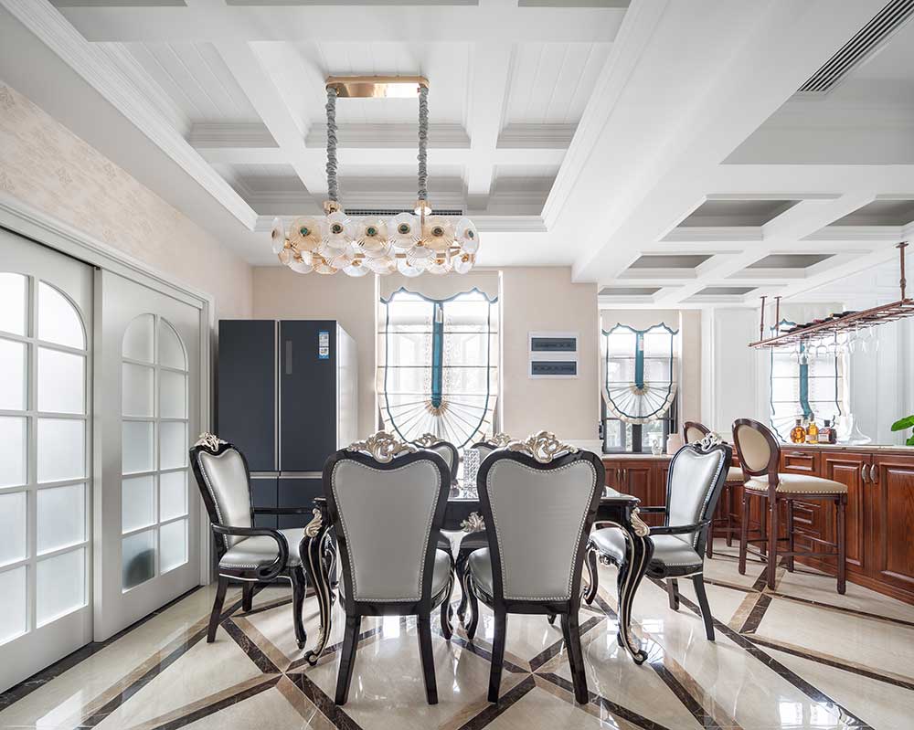 餐厅空间布局与陈设大气端雅、激情华丽,.菱形地面拼花与藻井式吊顶整洁雅致,搭配柔和的水晶灯饰,营造了一种舒适、温馨的用餐氛围。蓝白色罗马帘饰软搭更加强化了主体,利用线光源和点光源的变化,丰富了空间感觉,让业主感受到真正的人文关怀和奢华高贵。