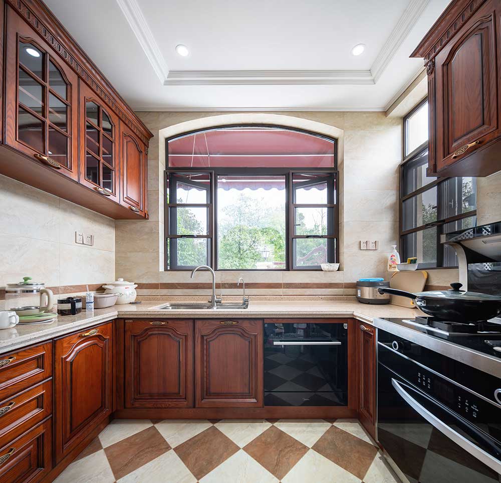 原木色能够让厨房看上去更加大气开放,而白色的台面则能够让厨房更显得干净整洁。这款厨房设计最大的特点就是将电器做进了橱柜里面,这种设计方式不仅能够让厨房的空间得到最大程度的利用。