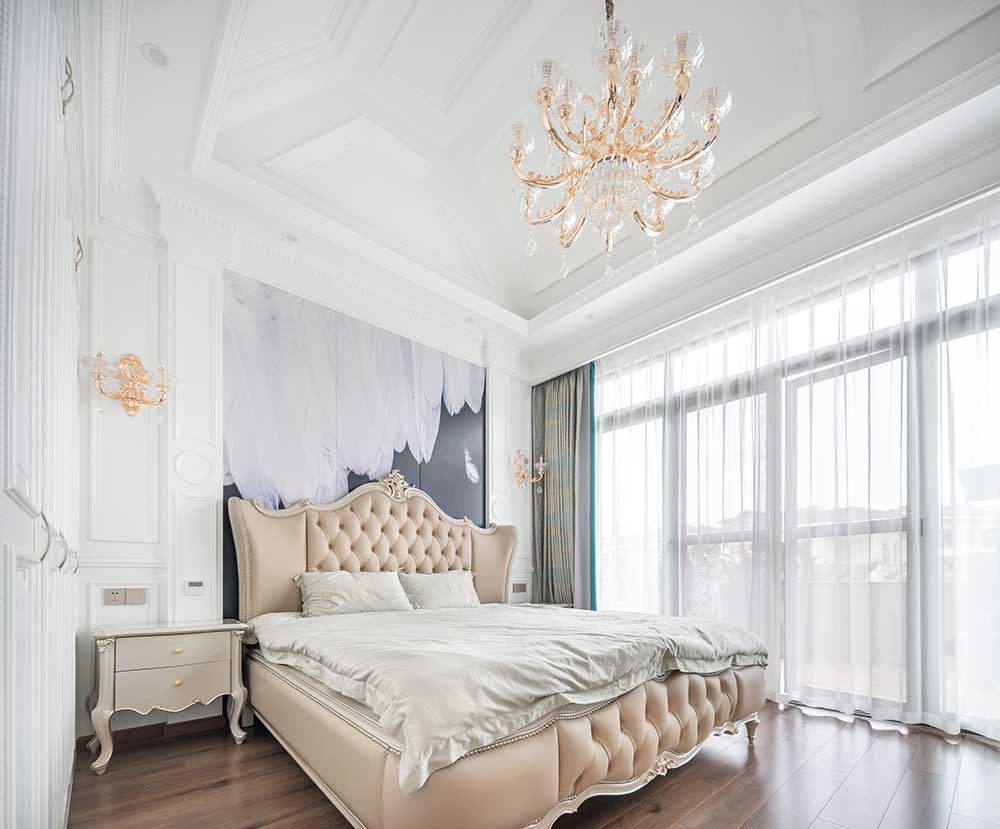 卧室以白色为基调,视觉主体干净而温和,轻奢水晶灯饰点缀,让每一个物件富有艺术灵性,当背景画幅介入时,让起居环境更添意境的享受。