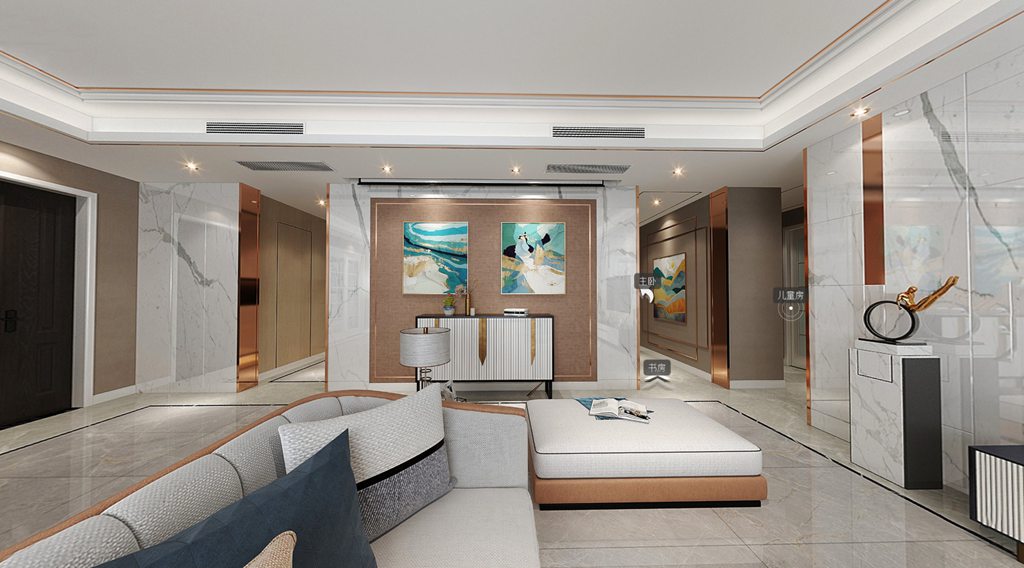 客厅主要诉求舒适大方,以优雅爵士白大理石布满电视主墙,任其滑面质感烘托自然日光。搭配金属材质,给沉闷的空间带来一抹清新,整个空间显得自然非凡。温和柔软的橘白拼色沙发搭配造型茶几,缔造出优雅奢华的家居质感。整个氛围如同室外穿透纱帘的阳光那般柔和,沉浸其中,精致的气韵在此间静谧地生长,让内心得以片刻的安放与升华。