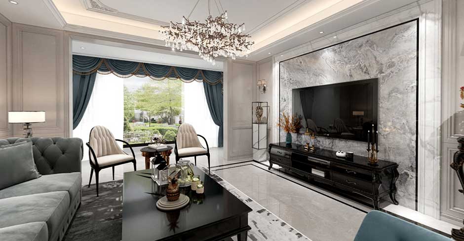 客厅设计上,现代轻奢浪漫高雅的情调适当诉诸于空间,高级灰磨砂沙发造型与雾面蓝窗帘交相呼应,电视背景墙使用大理石,不同材质的结合尽显低调奢华。