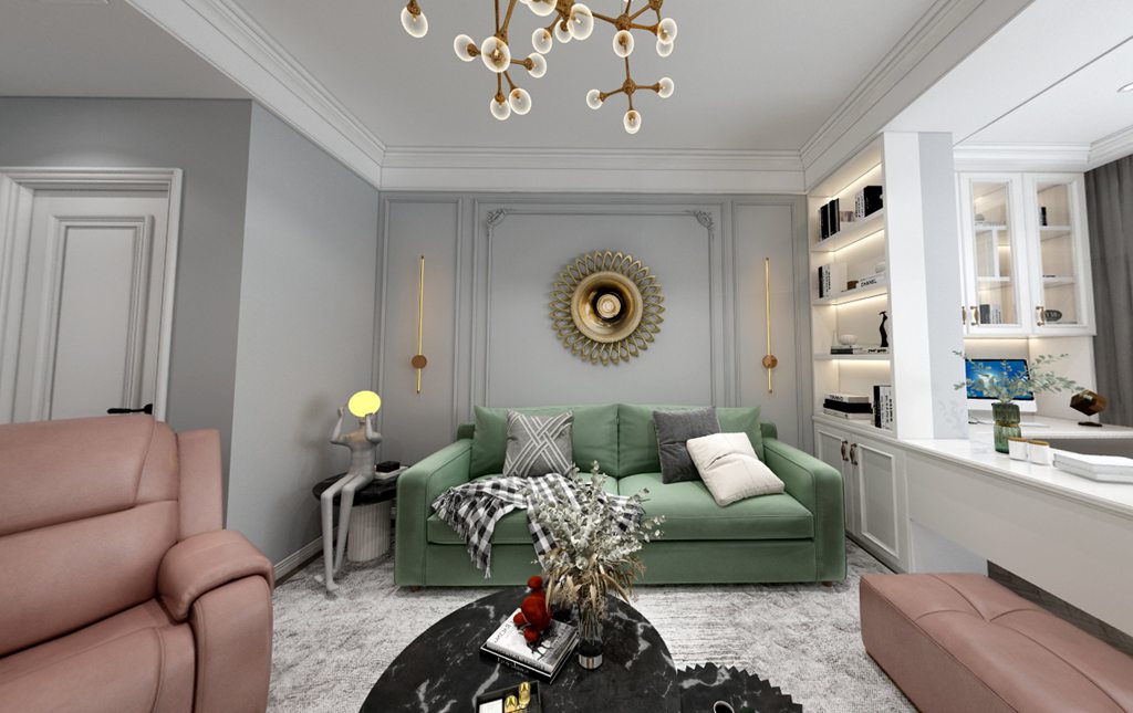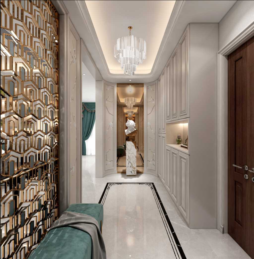 本案风格定位为现代轻奢,大多采用金属线条进行装饰,玄关墙采用硬包材质,在软装上用石膏雕刻工艺品点缀空间。一抹翡翠绿奠定轻奢氛围的基调,入户仿佛来到一个宫廷般的世界。