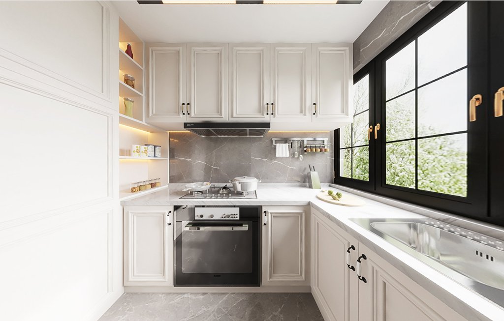 厨房通过改动门洞位置达到了橱柜的最大化利用,中西结合的U型橱柜在满足厨房使用需求的同时使得厨房的活动区域更大,使用起来更加顺手。