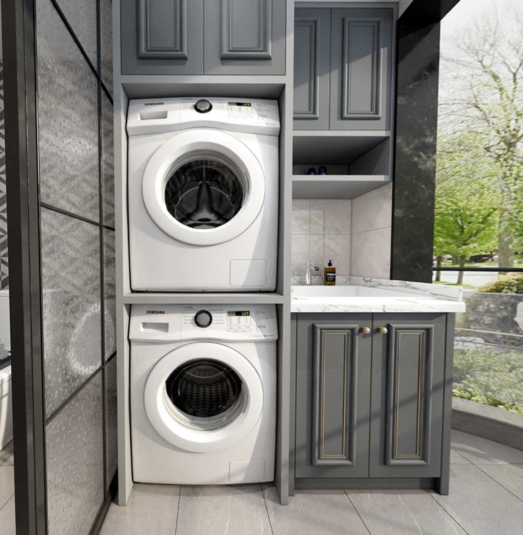 独立洗衣房设计,加定制洗衣机柜,最大限度的利用空间。利用阳台放置洗烘一体家电,高级灰的吊柜用于洗护收纳,居家的生活感就藏在这样的小细节中。