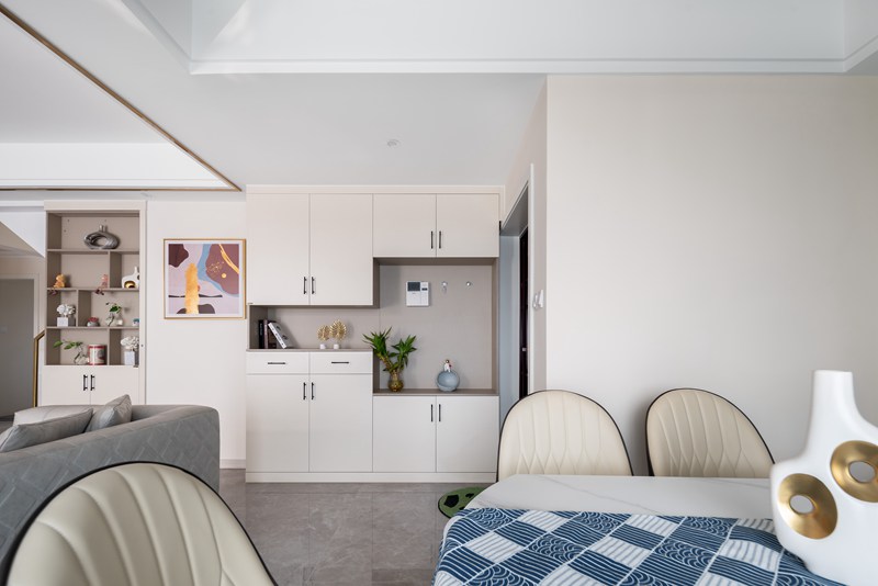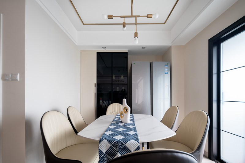 精致的格调、轻奢的质感,在餐厅空间中交汇。在设计师的精心构置下,黑白色拼接的皮革餐椅、白色大理石餐桌、金属几何灯具的组合,加之一抹蓝色桌旗的点缀,于温润的诗意中,碰撞出极具品质感的用餐氛围。冰箱一侧的酒柜采用黑色玻璃柜门与全实柜门结合,打造空间层次感。