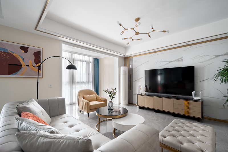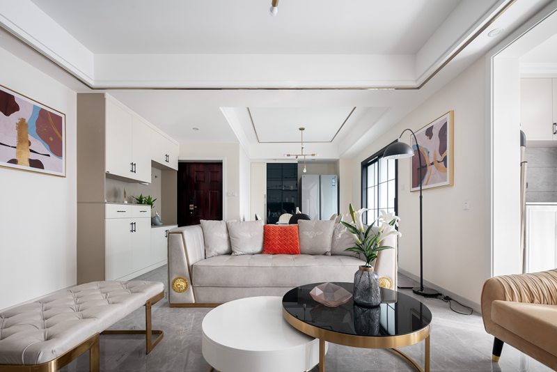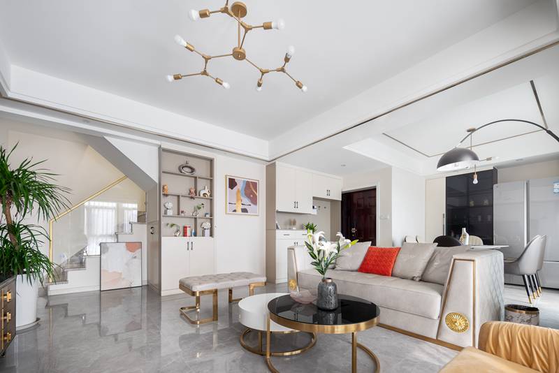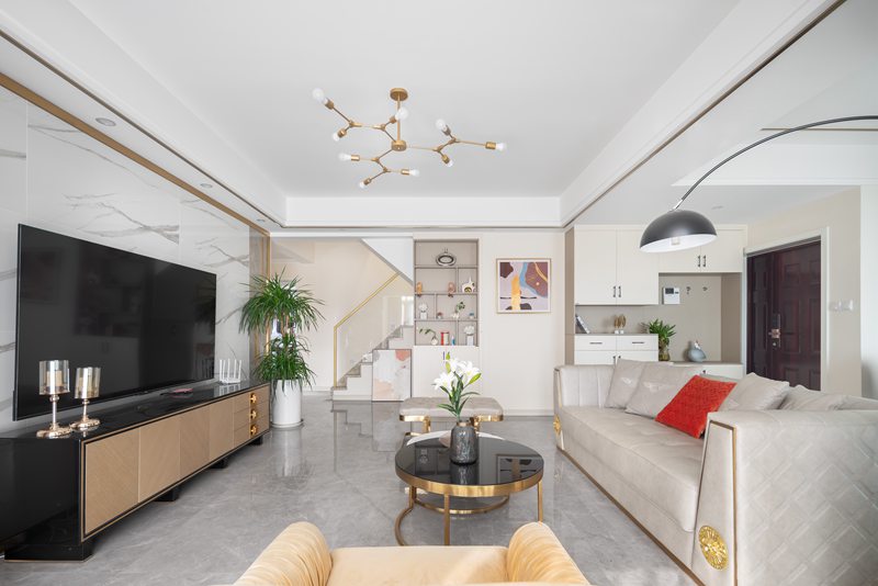 整个客餐厅以纯粹的白色调、浅米色为基底,同时点缀以雅致的大理石、轻奢金属组合,以丰富的肌理叠加,将精致时尚的都会风格延展开来,彰显着空间独特的仪式感。